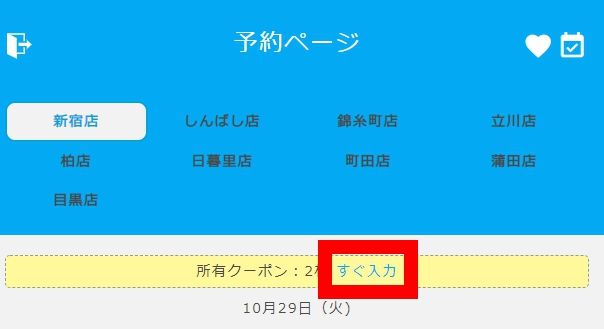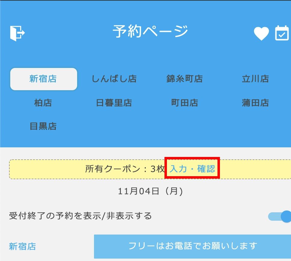 予約システムの、所有クーポンの→のすぐ「入力・確認」部分をタップしてください。