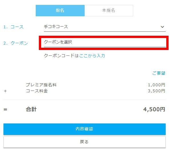 予約時にここから、所有しているオンライン・クーポンを選択すると、割引が適用されます。500円に満たない場合は使えませんので、500円以上貯まってから、複数のクーポンを選択してご利用ください。